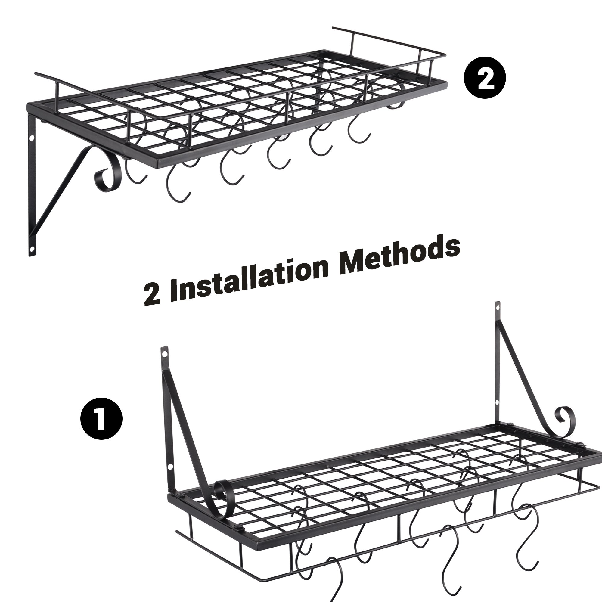 - Stylish Appearance - 2 installation methods: upward or downward brackets for different style; Metal made body with black color shows industrial style; perfect for modern and industrial style places; keep cookware or toiletries organized and decorate the place
